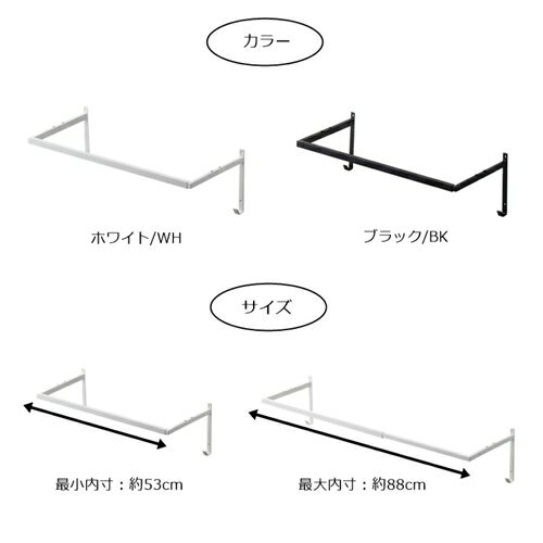 商品名 伸縮浴室扉前物干しハンガー タワー tower EXTENDED CLOTHES HANGER 品番 ホワイト/WH 05111 ブラック/BK 05112 サイズ 約W55.5〜90.5×D25.5×H18cm (内寸)約W53〜88×D24cm 商品重量 670g 耐荷重 約5kg 品質表示 本体:スチール(粉体塗装) 商品説明 ・取り付け可能な壁面:柱・板壁(厚さ10mm以上)・プリント合板(裏側に水平にサンがある場所) 裏に下地材(間柱)が入っている壁・木枠(幅15×厚さ20mm以上) ・付属品:木ネジ×4 六角レンチ ・組立式